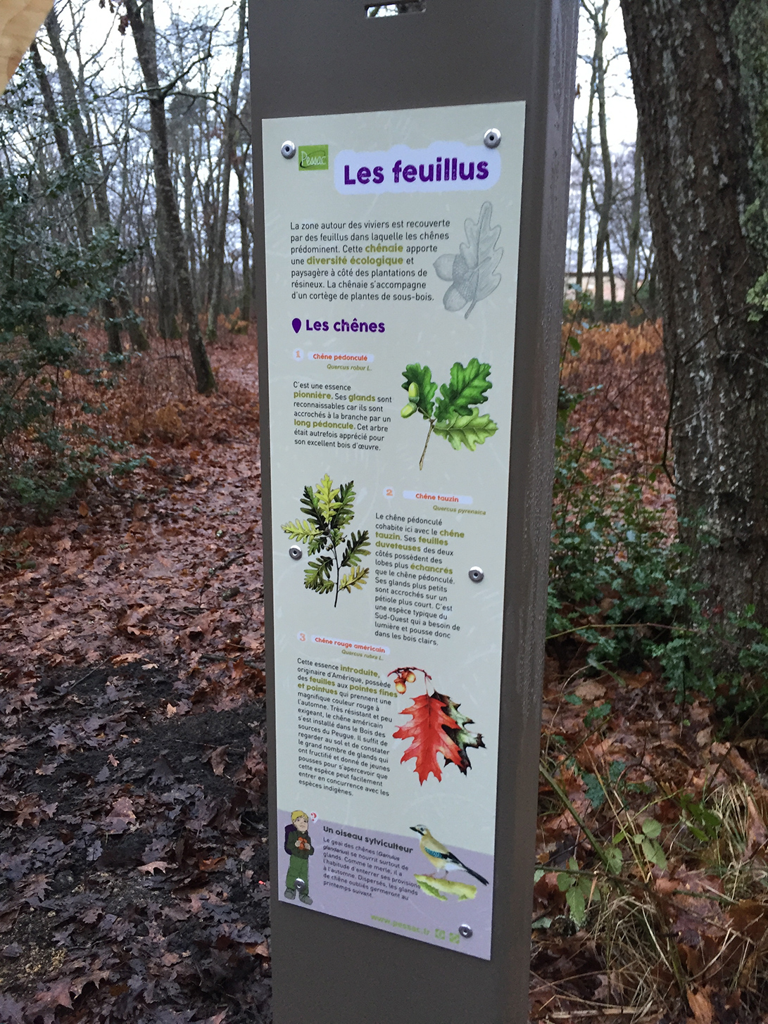 La direction de l’environnement de Pessac souhaitait installer un sentier d’interprétation pour souligner les richesses insoupçonnées de ces lieux. L’équipe du Bureau d’étude a ainsi décliné 3 thématiques de découverte qui se retrouvent dans des mobiliers spécifiques créés pour l’occasion.